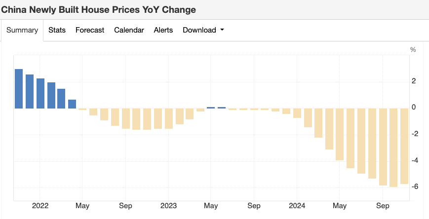 China masih menghadapi tekanan besar akibat melemahnya sektor properti. Harga rumah baru di 70 kota di China turun 5,7% secara tahunan pada November 2024, meskipun penurunannya lebih sedikit dibandingkan Oktober 2024 yang turun 5,9%. Namun tetap saja penurunan ini tidak bagus. Hal ini juga menandai penurunan selama 17 bulan beruntun, menunjukkan bahwa upaya pemerintah China seperti menurunkan suku bunga hipotek dan memangkas biaya pembelian rumah ternyata belum berhasil memperbaiki keadaan.