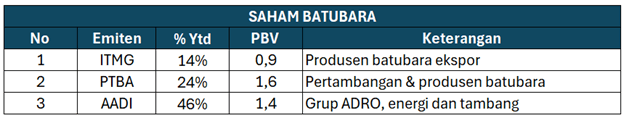 Saham batubara ikut menjadi perhatian di kala eskalasi geopolitik semakin memanas. Padahal beberapa waktu sebelumnya harga batubara cukup stagnan di level $110 per ton namun adanya konflik Iran dengan AS-Israel membawa harga batubara sampai pada level $138 per ton. Selain itu permintaan global masih tetap solid, terutama dari China yang masih menambah kapasitas pembangkit listrik berbasis batubara demi menjaga ketahanan energi, menjadi faktor penopang utama. Dengan harga batubara yang tinggi berpotensi memperkuat prospek pendapatan dan arus kas emiten batu bara. Beberapa saham emiten batubara yang berpotensi diuntungkan seperti: