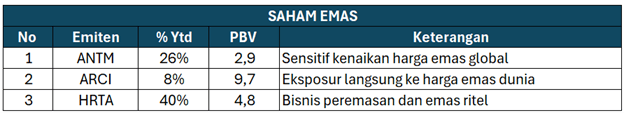 Saham komoditas metal khususnya emas terdampak juga lonjakan yang cukup signifikan. Melihat ketegangan konflik perang semakin memanas, emas yang dipandang sebagai hedging aset safe haven kembali banyak di lirik oleh pasar. Beberapa saham emiten emas yang berpotensi diuntungkan seperti: