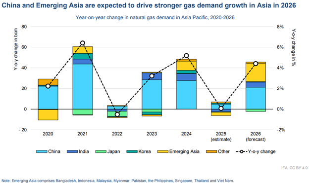 Proyeksinya pada tahun 2026, pertumbuhan konsumsi gas di negara-negara berkembang Asia salah satunya Indonesia diperkirakan meningkat sekitar 7%, didorong oleh pemulihan penggunaan gas di sektor industri & meningkatnya kebutuhan energi. Di tengah pasokan Timur Tengah yang di perketat dan permintaan Asia salah satunya Indonesia meningkat tentu ini menjadi tantangan tersendiri untuk memenuhi kebutuhan dalam negeri.