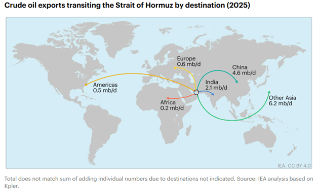 Selain gas alam, minyak mentah menjadi energi yang krusial melihat sebagian besar eskpor dari Selat Hormuz menuju Asia. Gangguan terhadap minyak mentah berdampak besar bagi pasar minyak. Lonjakan harga minyak yang sudah tercermin membuat kelangkaan fisik akan cepat terjadi jika gangguan tersebut berkepanjangan.