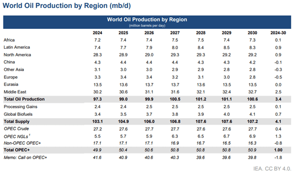 Jika dilihat per wilayah, Timur Tengah menjadi penyumbang kenaikan minyak terbesar. Produksi kawasan ini naik signifikan menjadi 32,7 juta barel per hari tahun 2030. Artinya, tambahan pasokan minyak dunia dalam beberapa tahun ke depan banyak bergantung pada negara-negara produsen besar di kawasan tersebut. Sementara Amerika Utara menjadi produksi terbesar kedua minyak dunia dengan proyeksi di tahun 2030 sebesar 29,2 juta barel per hari.