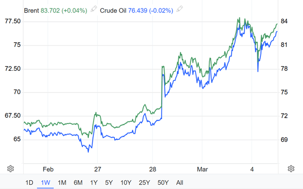 Komoditas energi seperti minyak mentah baik Brent maupun WTI terdampak kenaikan harga akibat eskalasi konflik yang mengakibatkan penutupan jalur di Selat Hormuz. Dalam seminggu terakhir minyak Brent & WTI naik signifikan sekitar 17%, masing-masing di level $82 per barel dan $77 per barel.