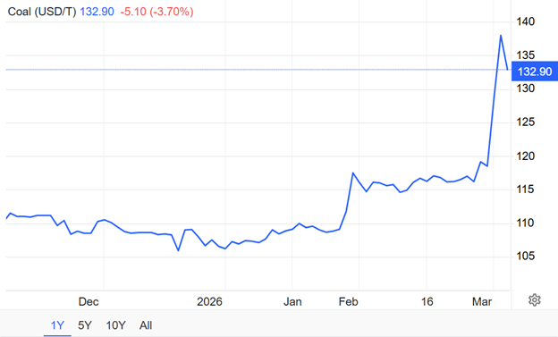 Komoditas energi yang ikut terdampak kenaikan harganya yaitu batubara. Dalam seminggu terakhir harga batubara sudah melonjak sekitar 15% sempat di level $138 per ton dan akhirnya terjadi koreksi. Lonjakan ini dipicu penghentian langka fasilitas LNG Qatar serta meningkatnya ketegangan di Timur Tengah yang mendorong peralihan bahan bakar di sektor kelistrikan.