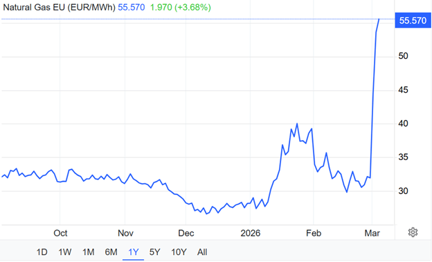 Gas alam berjangka eropa ikut terseret lonjakan harga yang signifikan, dalam seminggu terakhir naik signifikan sekitar 75% di level €55/MWh.