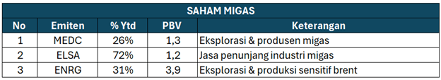 Kenaikan harga minyak dan gas berpotensi menjadi katalis positif bagi saham migas, terutama emiten yang memiliki eksposur produksi dan penjualan berbasis harga pasar global. Melihat komoditas energi minyak dan gas yang mengalami lonjakan signifikan, potensi perbaikan pendapatan dan margin menjadi daya tarik tersendiri bagi pelaku pasar. Beberapa saham emiten migas yang berpotensi diuntungkan seperti: